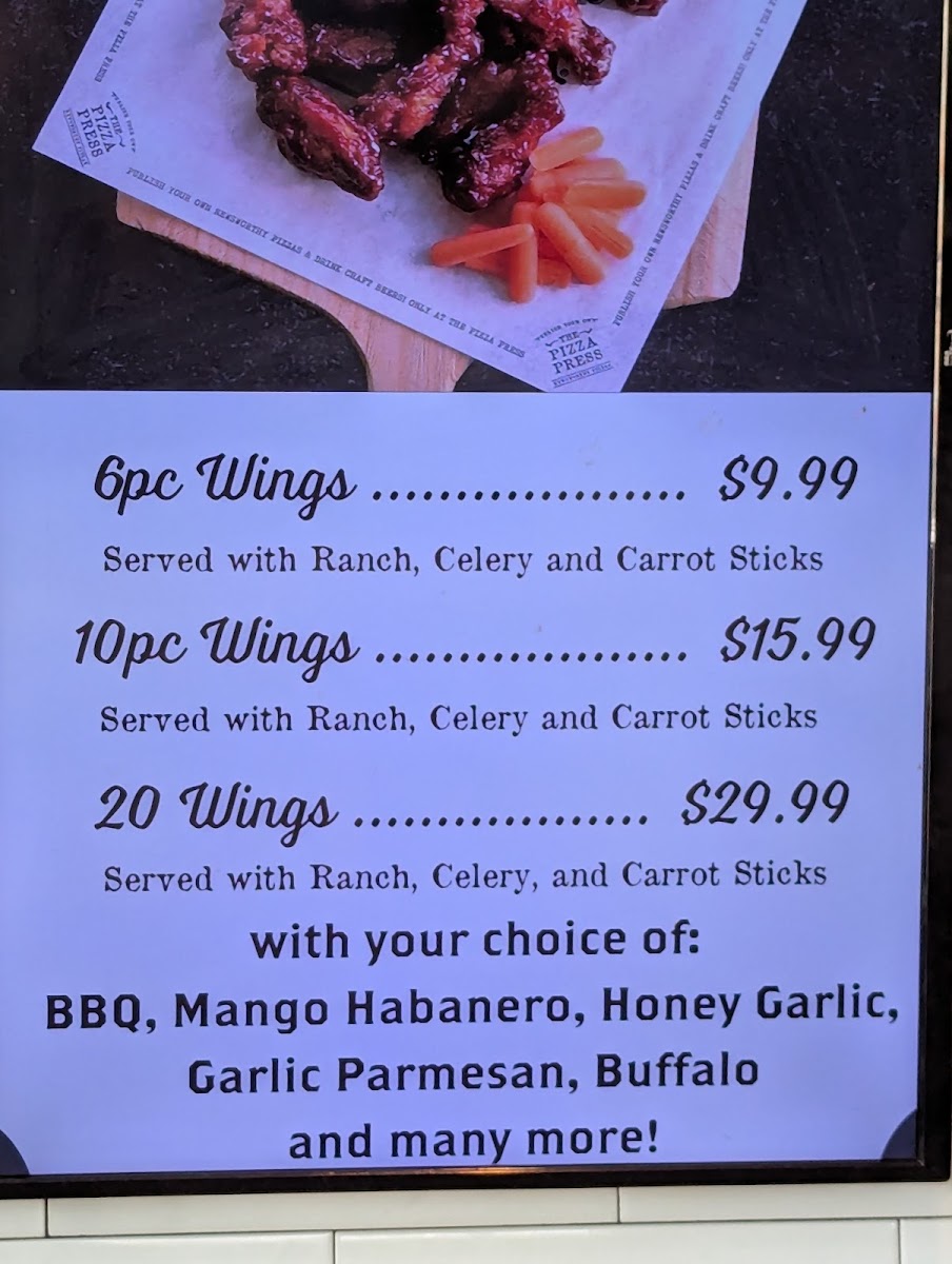 20 ct Traditional Bone in Wings with choice of wing sauce, and side dipping sauce. *availability of carrot and celery may vary by location