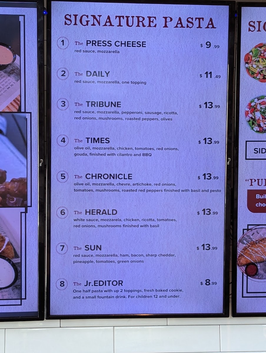 Build A Completely Custom PASTA PENNE With The Day’s Freshest Ingredients! Use our ingredients list below to choose what you’d like on your PASTA. Endless Combinations!